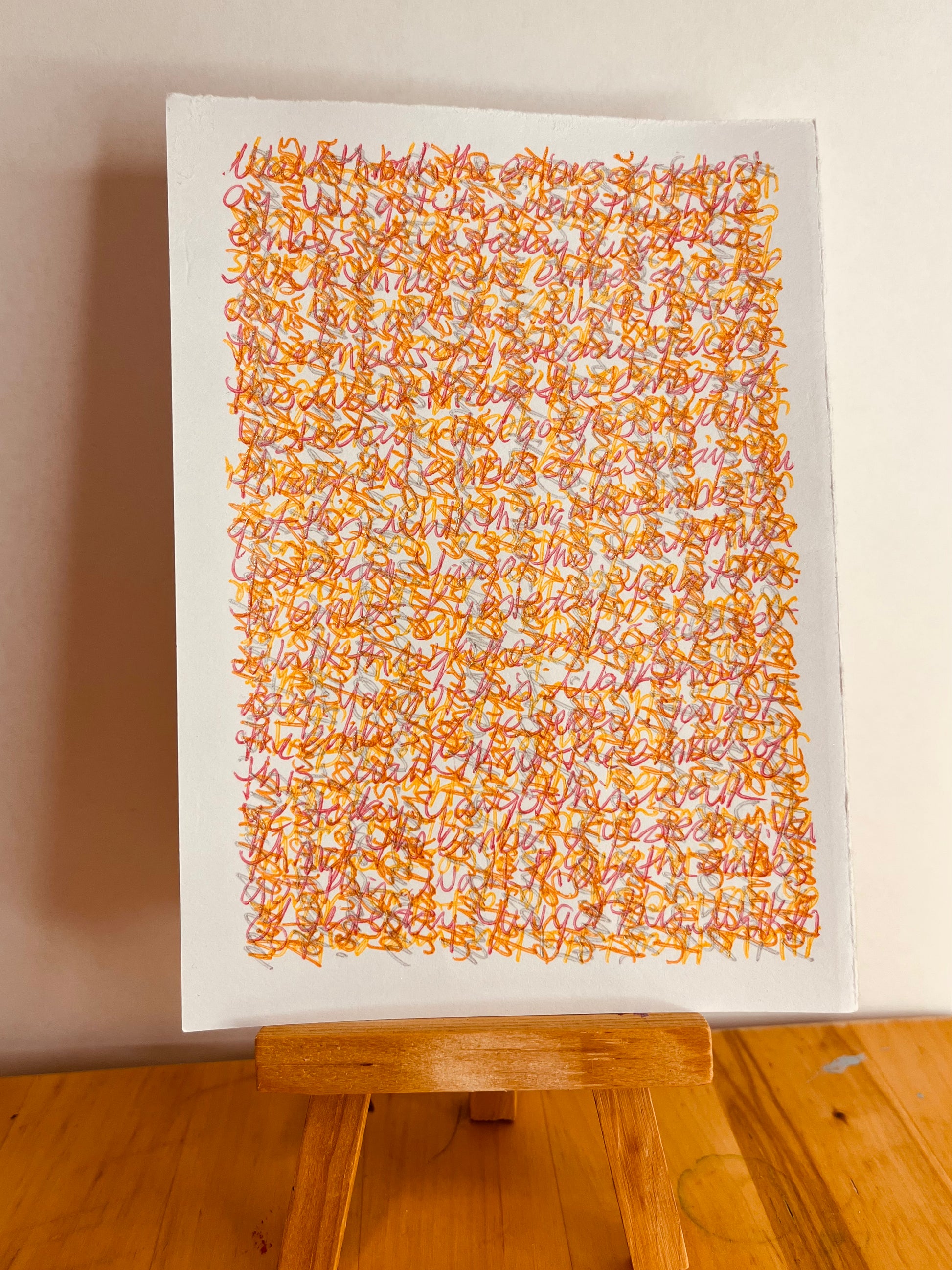 Displayed are feminist rants written out in green, pink, orange and purple. And like all feminist rants, the message gets lost in the noise of the world.
