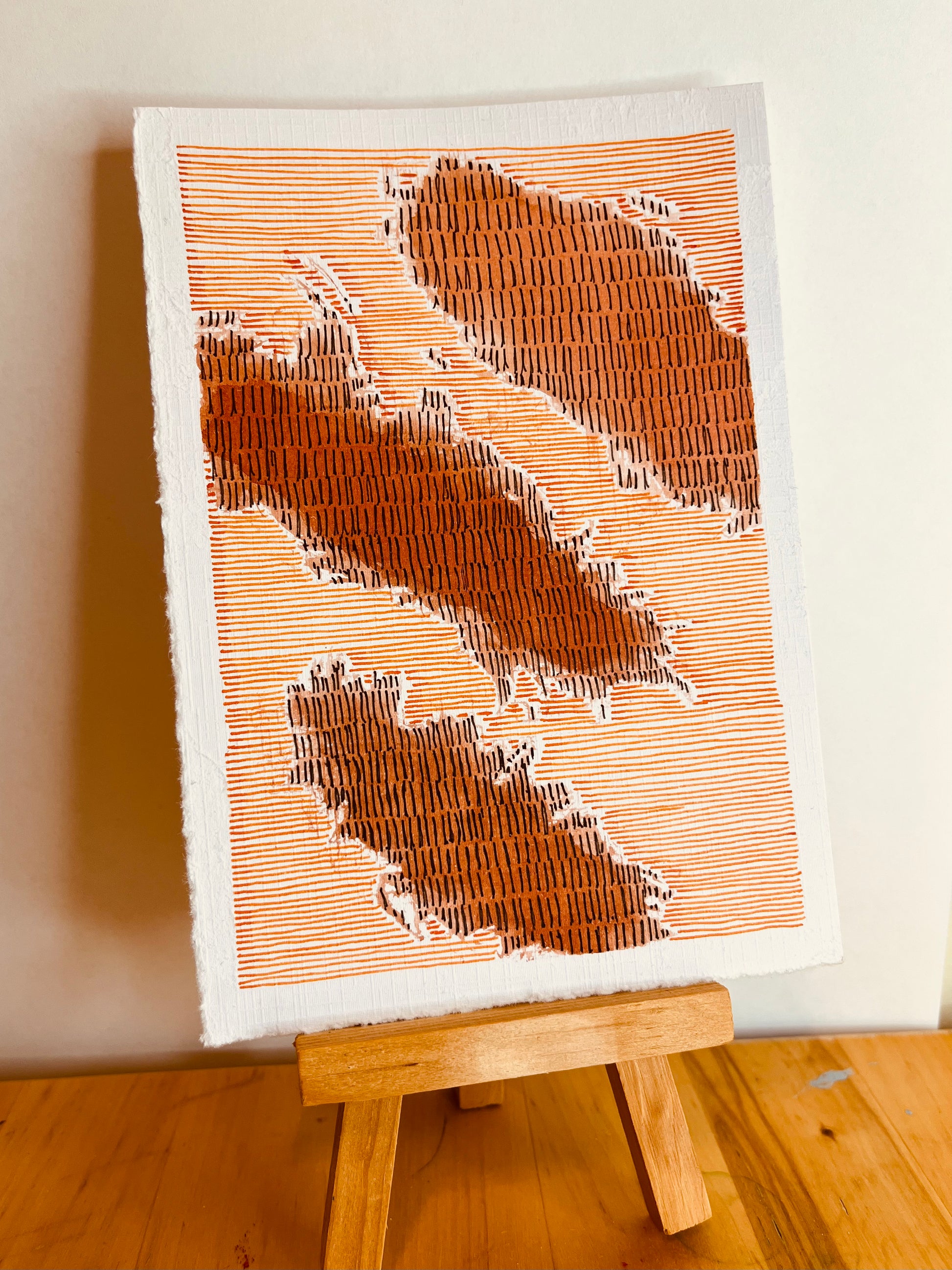 Created with watercolour and calligraphy ink, this original postcard is created on thick art paper. Called "Kartografi" ("Cartography" in Norwegian), this piece is reminicient of three islands surrounded by water.